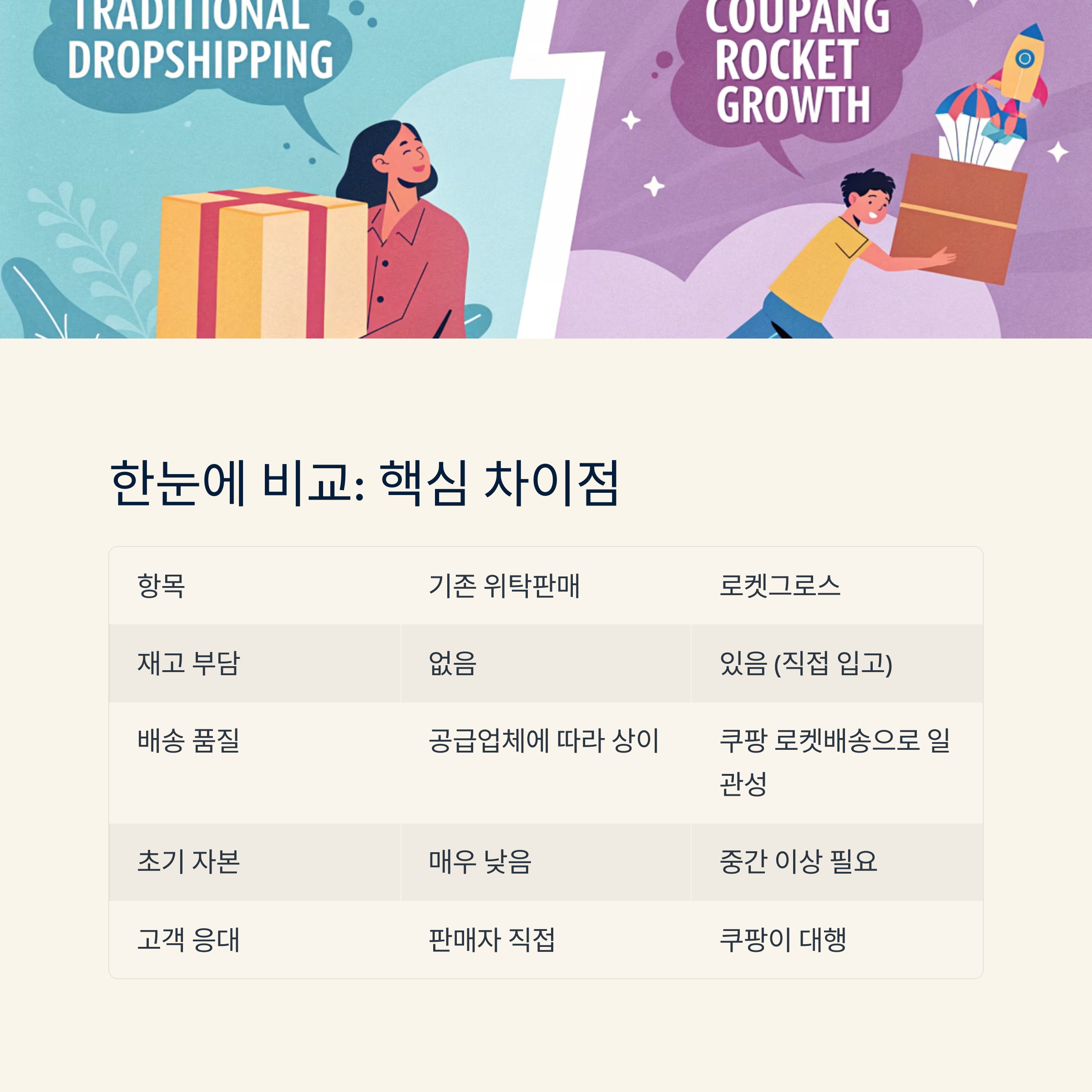 | 운영 방식 | 주문 후 공급사 대응 | 입고 후 쿠팡이 전체 운영 |