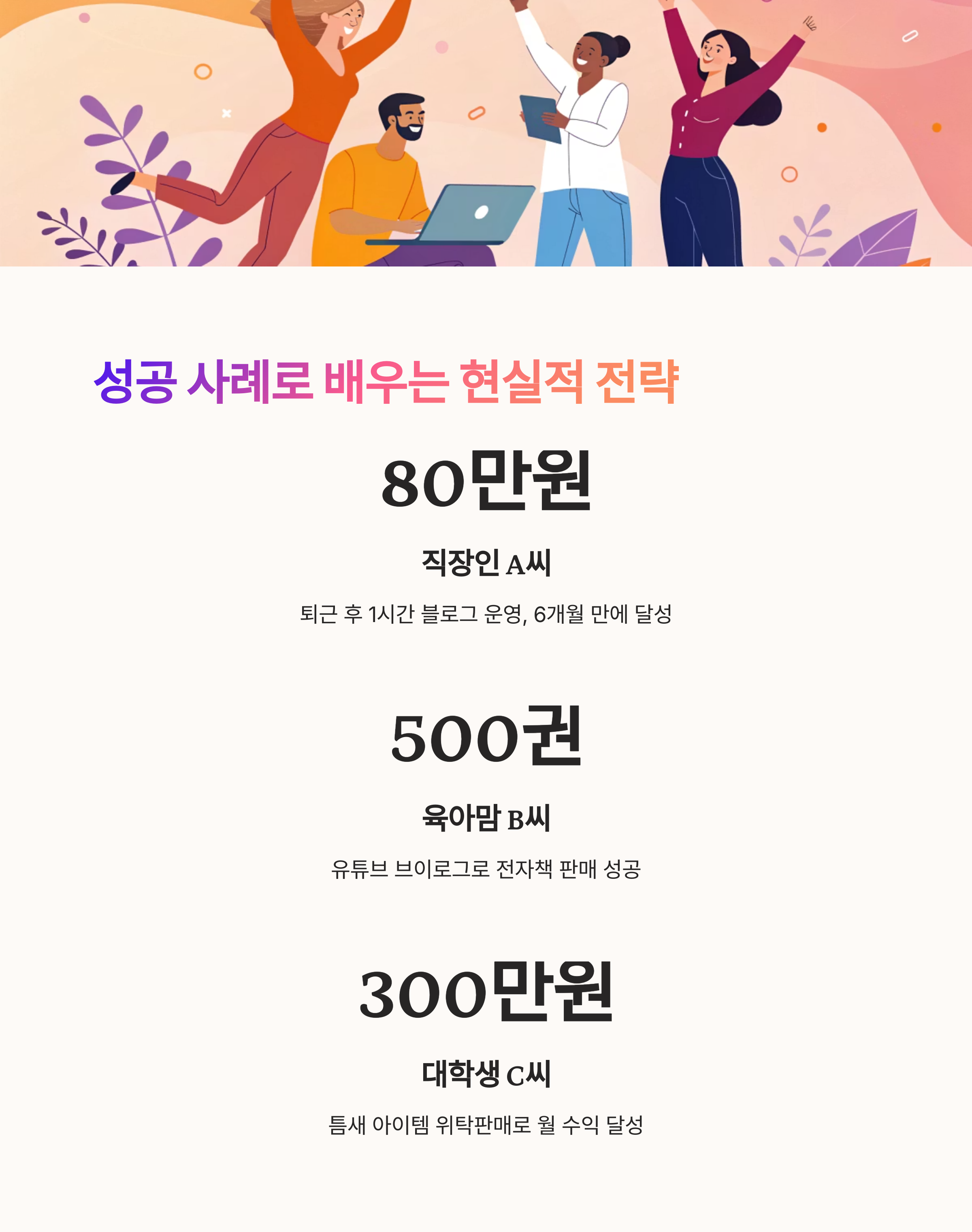 - 대학생 C씨: 틈새 아이템 위탁판매 → 스마트스토어 월 300만 원 이상 달성