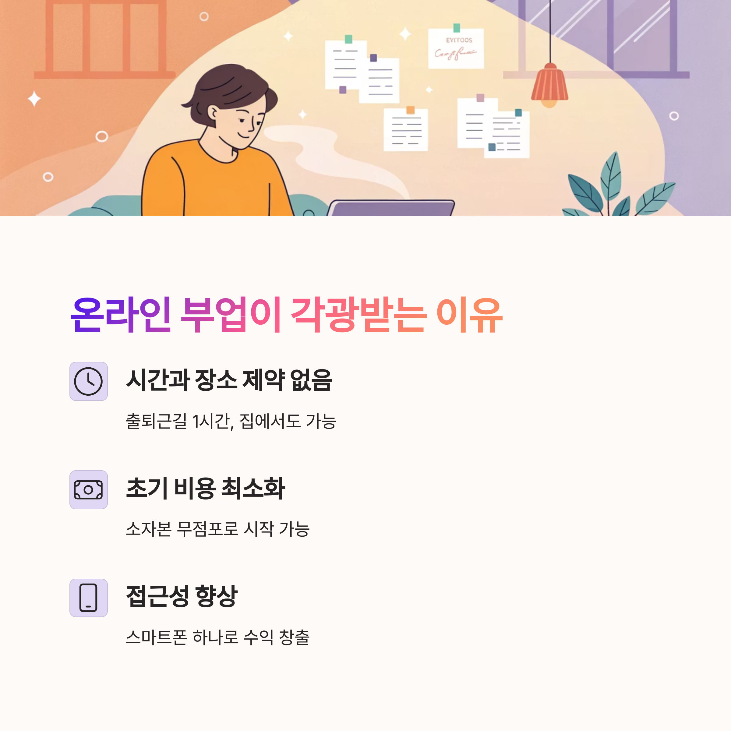 초기 비용이 거의 들지 않기 때문에 직장인·주부·대학생 모두 쉽게 도전할 수 있습니다.
